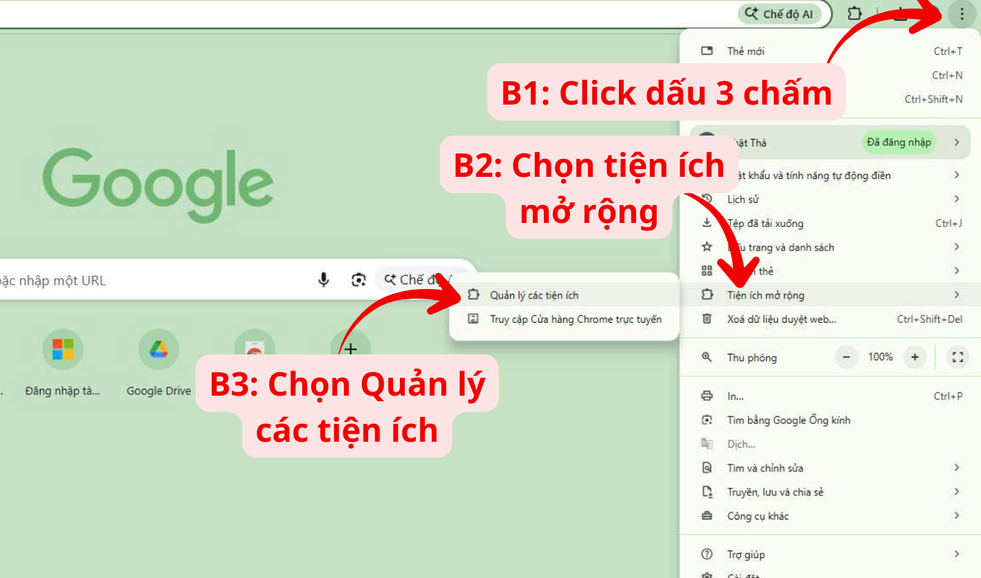 - Phía trên bên phải màn hình: Chọn Tuỳ chỉnh → Tiện ích mở rộng → Quản lý các tiện ích